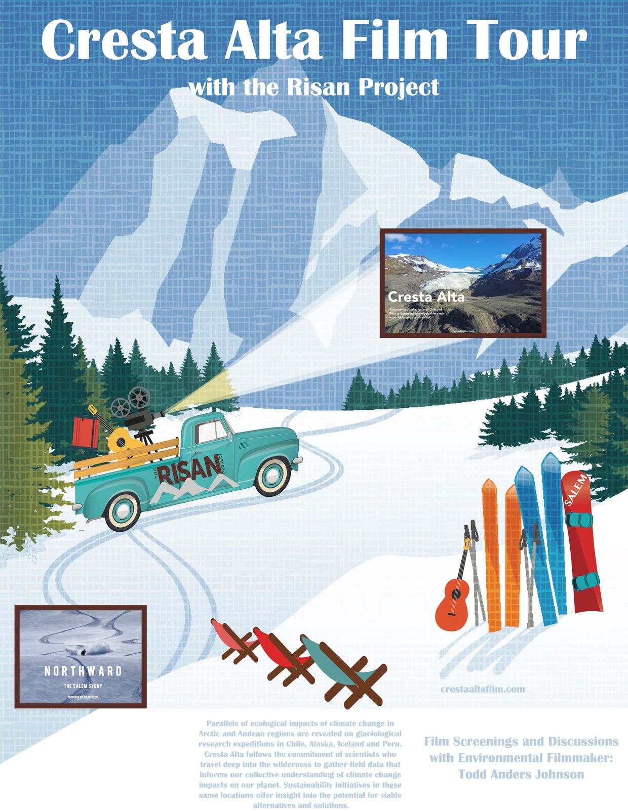 The Cresta Alta Film Tour is engaging audiences throughout the US with arts councils, colleges, high schools and museums at events produced by The Risan Project. The 2025 tour features Risan Media's expedition-based climate change documentary film titled, Cresta Alta, that chronicles a journey to Alaska, Iceland, Chile and Peru to document glaciological research expeditions and sustainability. The screenings are followed by a discussion/Q&A with producer and director, Todd Anders Johnson, that connects Cresta Alta's global environmental messaging to local and regional environmental movements.